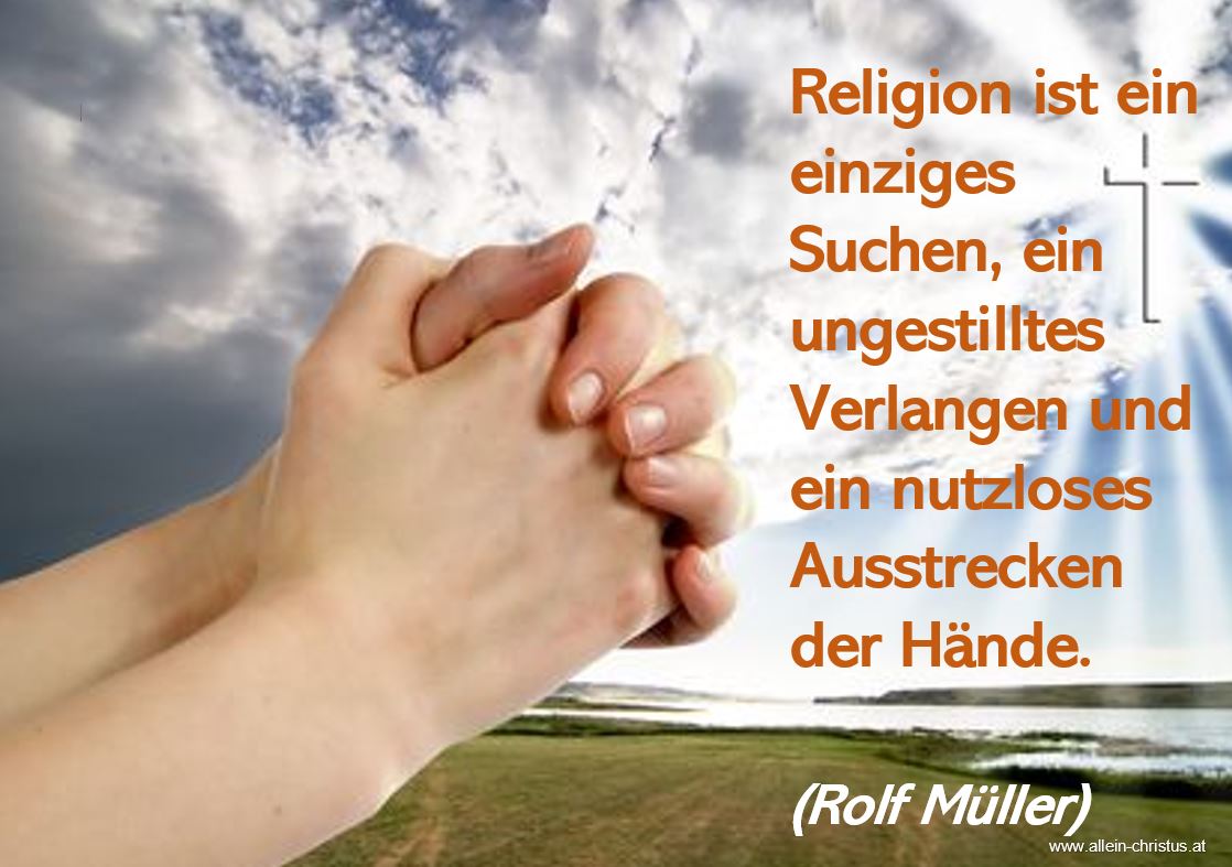 In eigenem Denken und Wollen haben alle Völker die Rückbindung an Gott gesucht und entwickelten dabei die unterschiedlichsten Religionen. Das Wort Religion stammt von dem lateinischen religio (= Gewissenhaftigkeit, Gottesfurcht), das sich wohl von dem Verb religiare (= an-, zurückbinden) herleitet. Diese Anbindung wird im Wesentlichen durch zwei alle Religionen kennzeichnende Charakteristika versucht: durch mancherlei menschlich ersonnene Vorschriften (z. B. Opferriten) und durch für wichtig erachtete Gegenstände (z. B. Buddhafiguren, Gebetsmühlen, die Kaaba in Mekka).